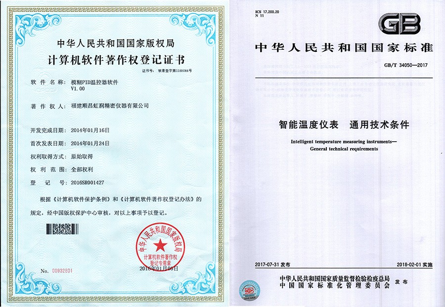 虹潤(rùn)公司模糊PID溫控器是虹潤(rùn)公司應(yīng)用自主知識(shí)產(chǎn)權(quán)開(kāi)發(fā)的新一代智能控制儀表,產(chǎn)品榮獲模糊PID控制儀及控制方法(專(zhuān)利號(hào)2015109378814)、一種智能化控制器及自整定方法(2016103155465)2項(xiàng)國(guó)家發(fā)明專(zhuān)利,傻瓜式模糊PID調(diào)節(jié)儀軟件V1.00(版權(quán)登記號(hào)2015SR171602)、模糊PID溫控器軟件V1.00(版權(quán)登記號(hào)2016SR001427)2項(xiàng)軟件著作權(quán),主持起草《智能溫度儀表 通用技術(shù)條件 GB/T 34050-2017》《工業(yè)過(guò)程控制系統(tǒng)用模擬輸入兩位或多位輸出儀表第2部分:檢查和例行試驗(yàn)導(dǎo)則》2項(xiàng)國(guó)家標(biāo)準(zhǔn)。其中《工業(yè)過(guò)程控制系統(tǒng)用模擬輸入兩位或多位輸出儀表第2部分:檢查和例行試驗(yàn)導(dǎo)則》標(biāo)準(zhǔn)正在起草中。