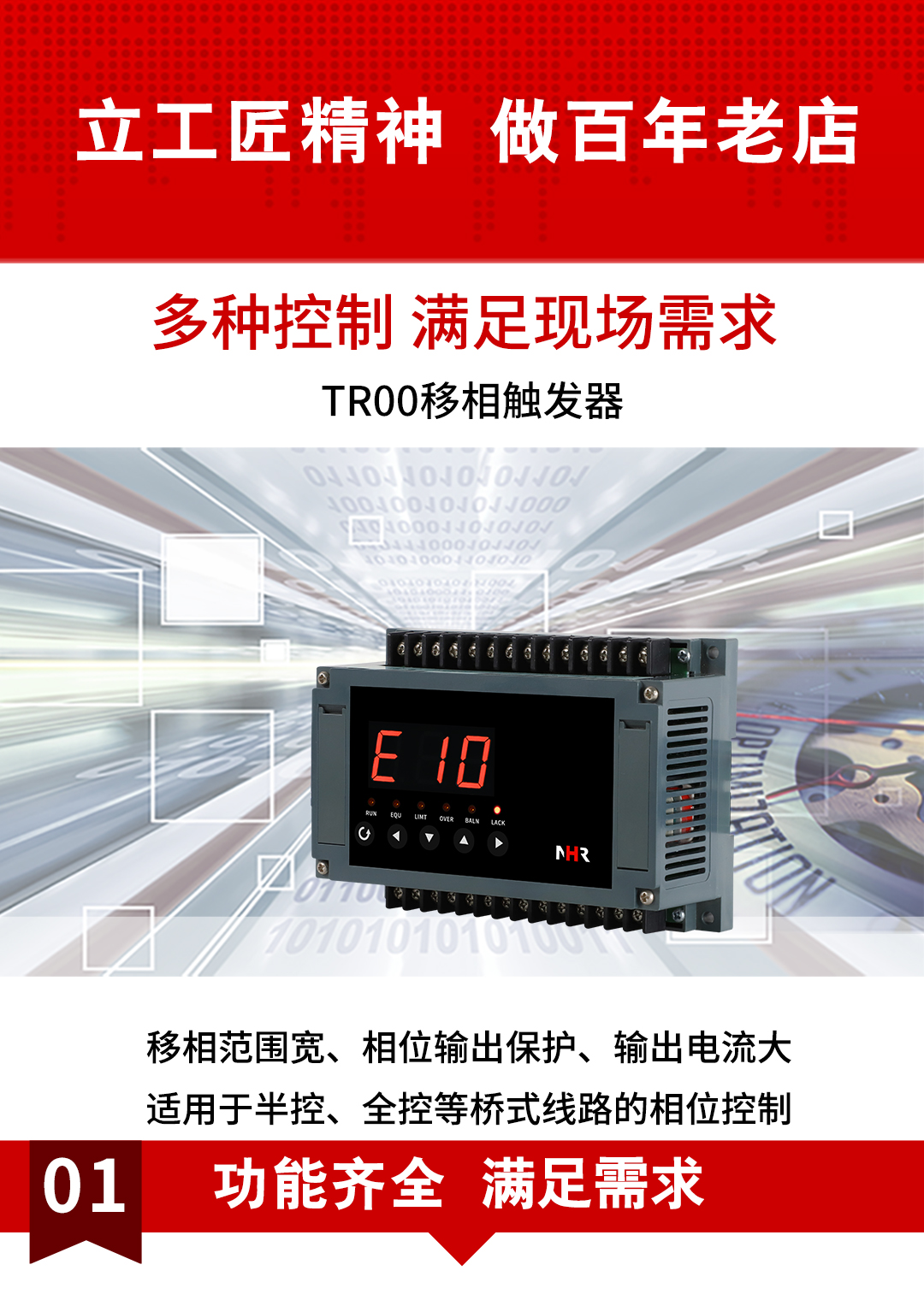 NHR-TR00系列移相觸發(fā)器適用于雙向可控硅、兩個(gè)單向可控硅反并聯(lián)等交流相位控制,它分為單相移相觸發(fā)器和三相移相觸發(fā)器兩種類型,采用DIN35mm導(dǎo)軌方式安裝。產(chǎn)品具有鋸齒波線性好、移相范圍寬、控制方式簡單,相位輸出保護(hù)、輸出電流大等優(yōu)點(diǎn)。它可與多種溫度控制器配合使用,廣泛應(yīng)用于電爐、窯爐、工業(yè)爐等行業(yè)的溫度控制。