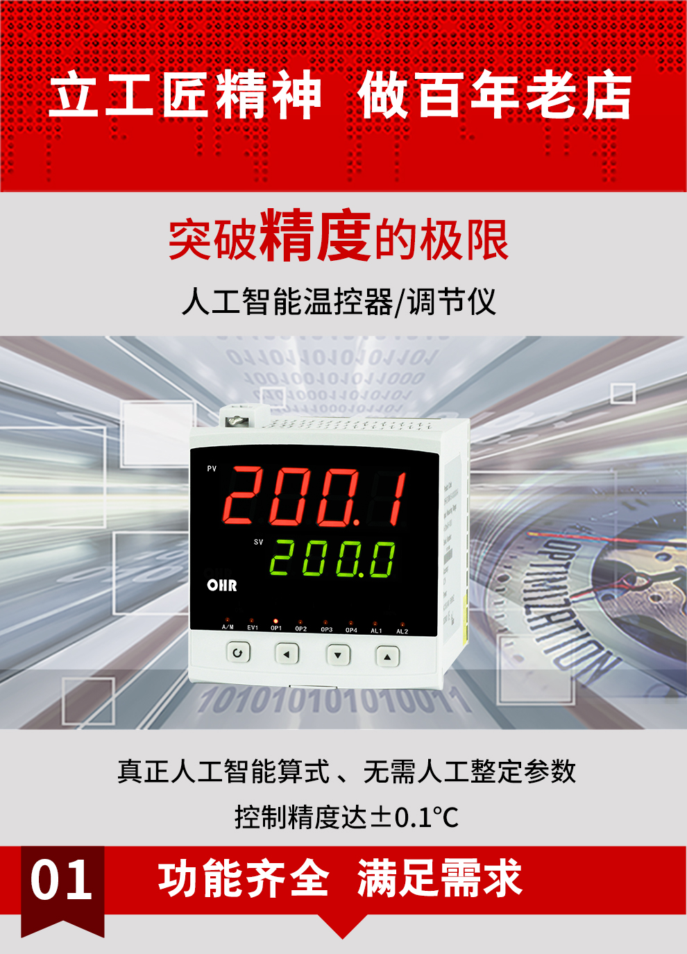OHR-E300系列人工智能調(diào)節(jié)儀采用真正的人工智能算式,儀表啟動(dòng)自整定功能,可以根據(jù)被控對(duì)象的特性,自動(dòng)尋找參數(shù)以達(dá)到很好的控制效果,無需人工整定參數(shù)??販鼐然具_(dá)±0.1℃,無超調(diào)、欠調(diào),達(dá)國際先進(jìn)水平。