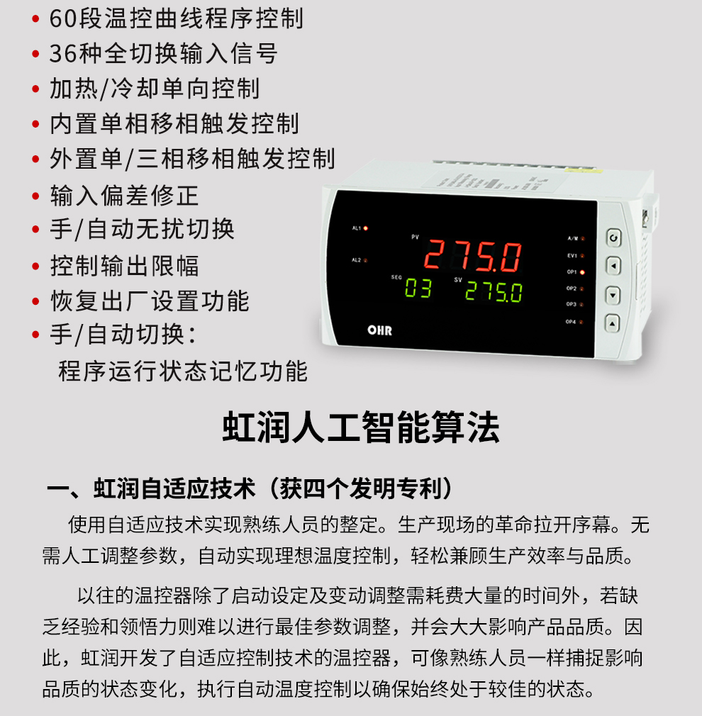 OHR-E400系列60段人工智能溫控器采用真正的人工智能算式,儀表啟動自整定功能,可以根據(jù)被控對象的特性,自動尋找參數(shù)以達到很好的控制效果,無需人工整定參數(shù)??販鼐然具_±0.1℃,無超調(diào)、欠調(diào),達國際先進水平。