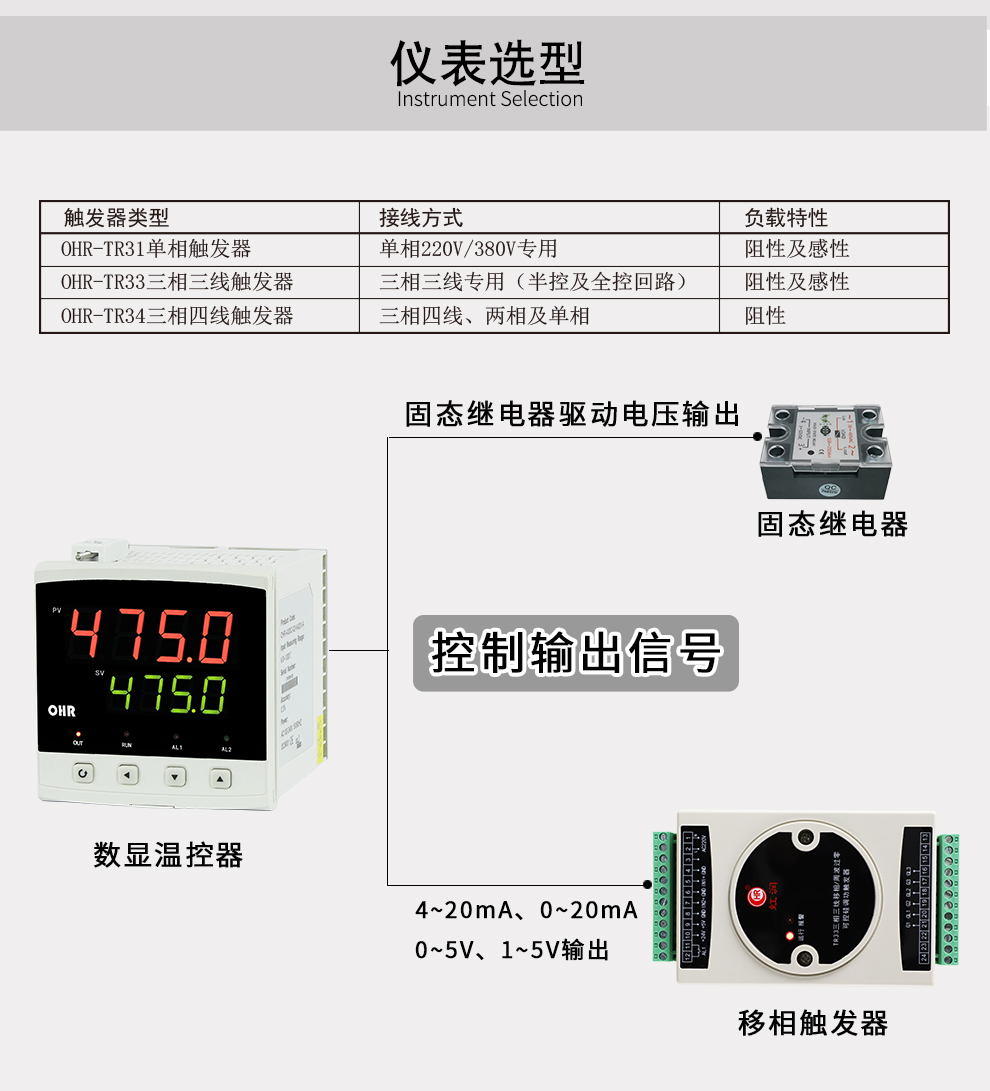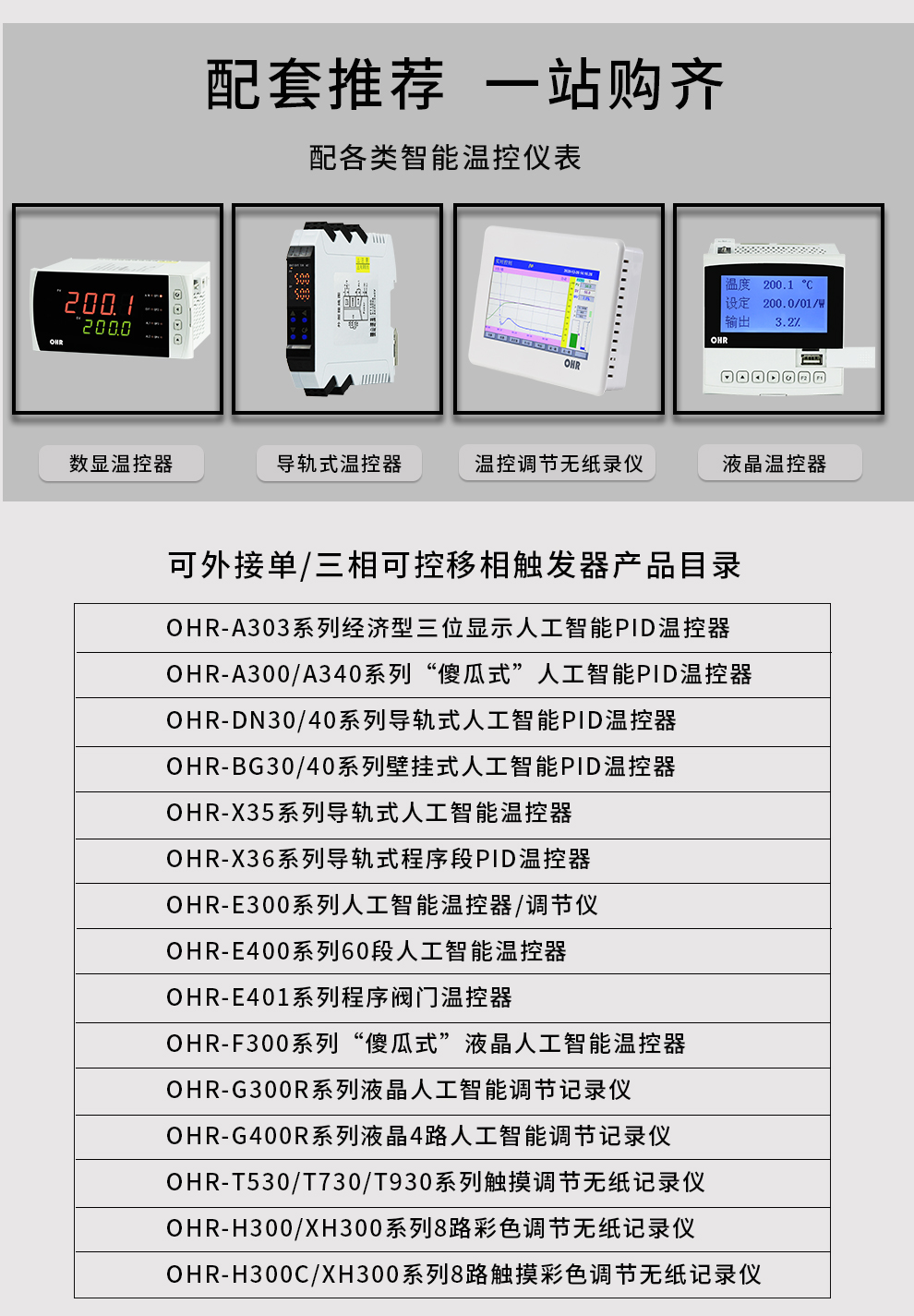 OHR-TR30系列移相觸發(fā)器是應(yīng)用了單片機技術(shù)的智能化單/三相移相觸發(fā)器,功能強大且可靠性高,能適應(yīng)各種 電阻絲、硅碳棒及負(fù)載采用變壓器降壓的硅鉬棒、鎢絲等各種類型工業(yè)電爐,也可用于電機軟啟動的控制。