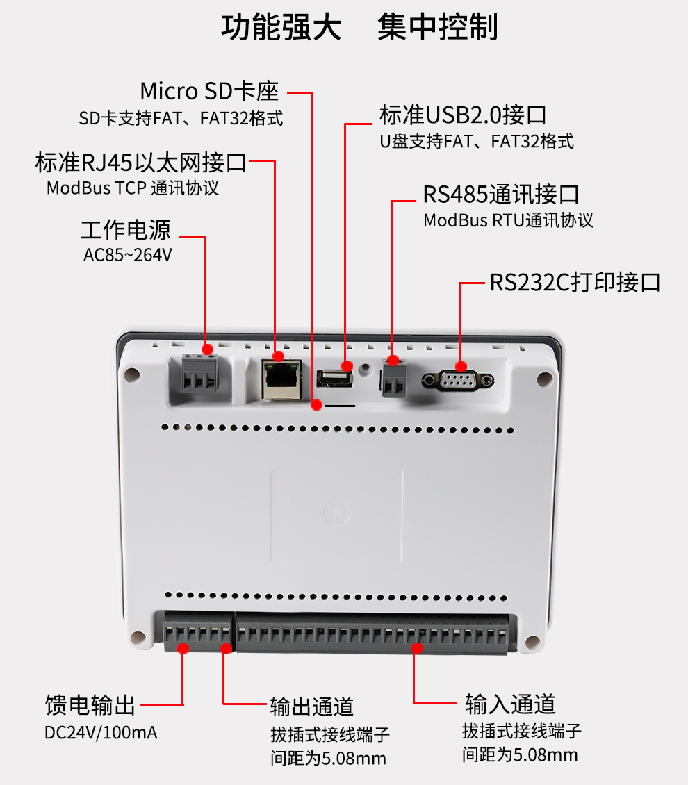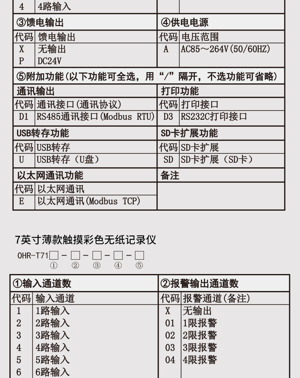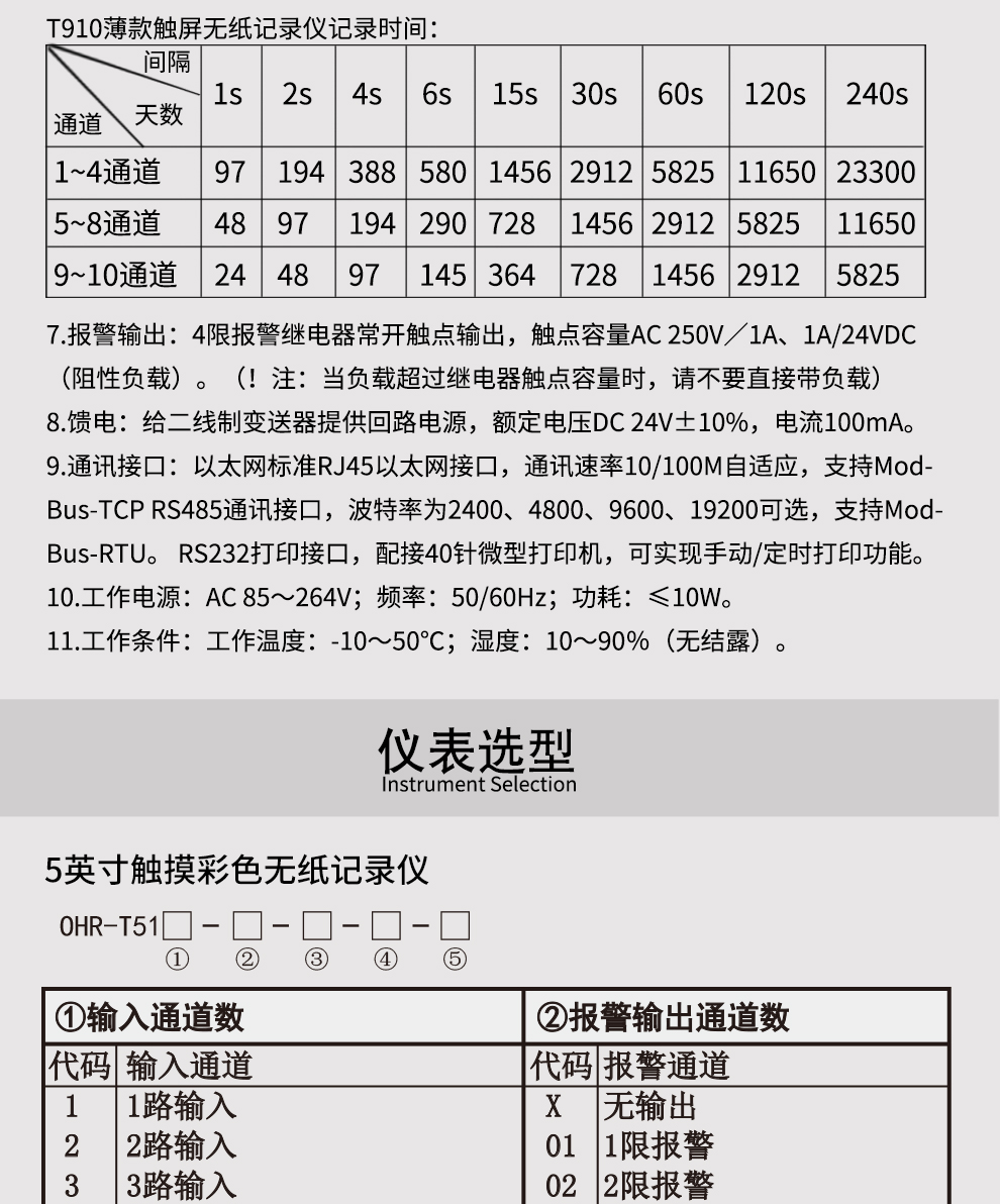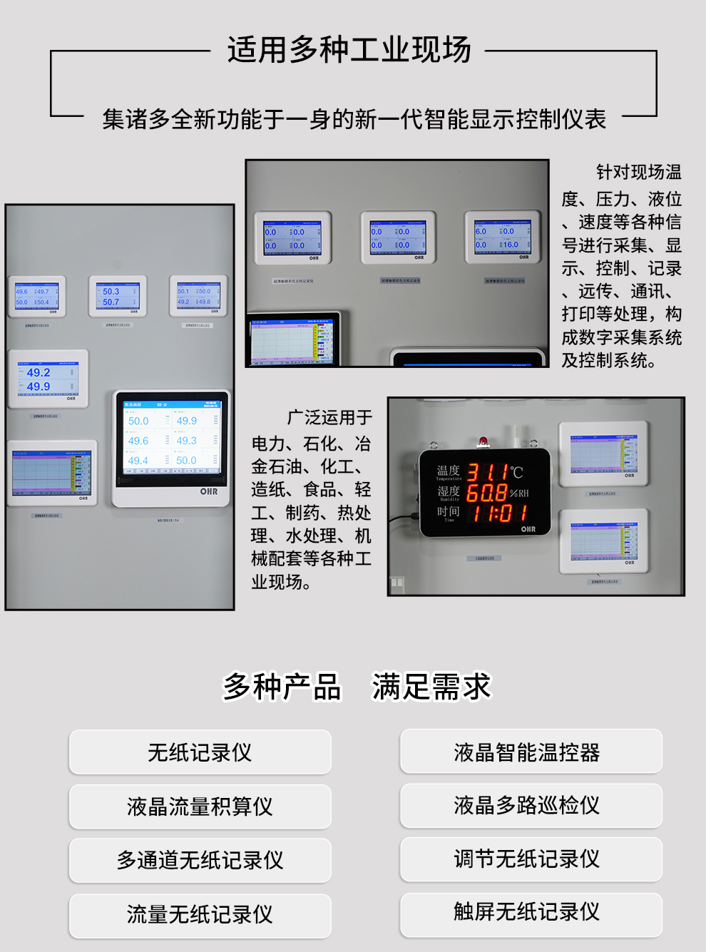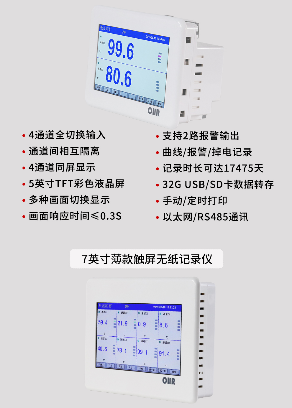 OHR-T系列觸摸超薄無紙記錄儀采用新型大規(guī)模集成電路,對輸入、輸出、電源、信號采取可靠保護(hù)和強(qiáng)抗干擾設(shè)計(jì)。8路萬能信號輸入(可組態(tài)選擇輸入:標(biāo)準(zhǔn)電壓、標(biāo)準(zhǔn)電流、熱電偶、熱電阻、頻率、毫伏等)??蓭?路報(bào)警輸出,1個(gè)饋電輸出,RS485通訊接口,以太網(wǎng)接口,微型打印機(jī)接口和USB接口,SD卡插座。