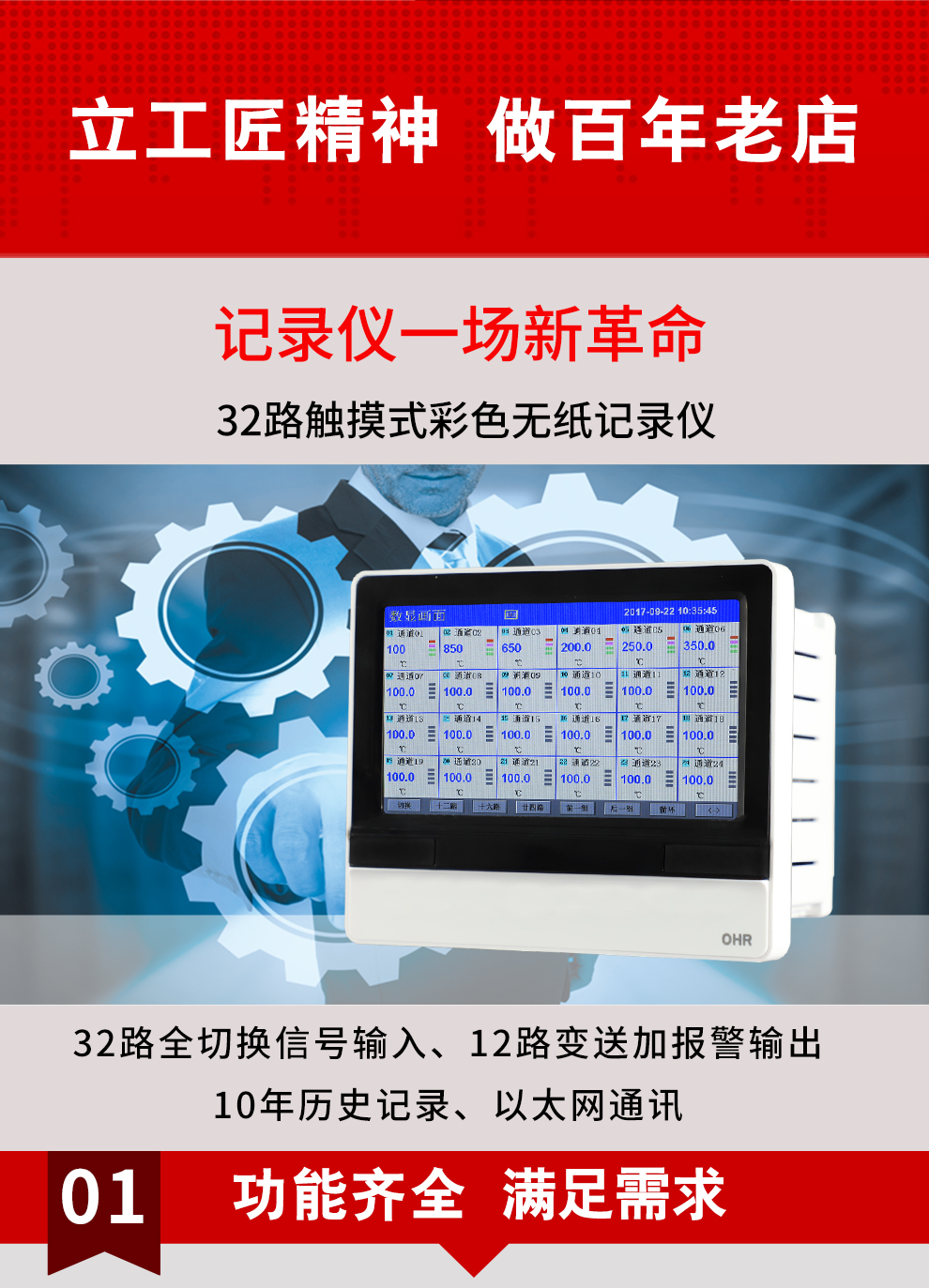 OHR-H700C系列觸摸式彩色無紙記錄儀用新型大規(guī)模集成電路,對輸入、輸出、電源、信號采取可靠保護(hù)和強(qiáng)抗干擾設(shè)計(jì)。32路萬能輸入,可帶12路報(bào)警或12路變送輸出,RS232/485通訊接口,以太網(wǎng)接口,微型打印機(jī)和USB接口,SD卡插座;可提供傳感器配電;具有強(qiáng)大的顯示功能,實(shí)時(shí)曲線顯示,歷史曲線追憶等。