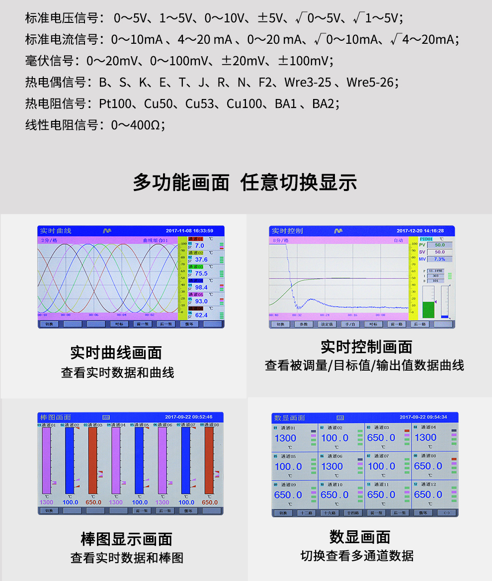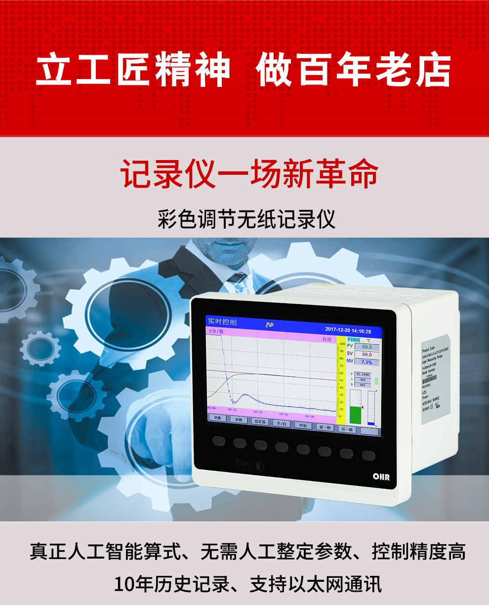OHR-H300系列彩色調(diào)節(jié)無紙記錄儀采用真正的人工智能算式,儀表啟動自整定功能,可根據(jù)被控對象的特性,自動尋找最優(yōu)參數(shù)以達到很好的控制效果,無需人工整定參數(shù)。控溫精度基本達±0.1℃,無超調(diào)、欠調(diào),達國際先進水平。24路萬能輸入(可組態(tài)選擇輸入:標(biāo)準(zhǔn)電壓、標(biāo)準(zhǔn)電流、熱電偶、熱電阻、毫伏等)其中可帶8路控制輸入。