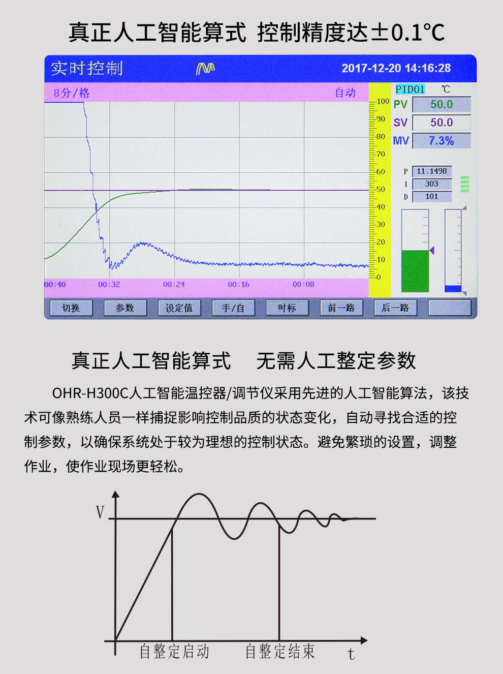 OHR-H300C系列觸摸式溫控器采用真正的人工智能算式,儀表啟動自整定功能,可以根據(jù)被控對象的特性,自動尋找最優(yōu)參數(shù)以達到很好的控制效果,無需人工整定參數(shù)??販鼐然具_±0.1℃,無超調(diào)、欠調(diào),達國際先進水平。24路萬能輸入(可組態(tài)選擇輸入:標準電壓、標準電流、熱電偶、熱電阻、毫伏等)其中可帶8路控制輸入。