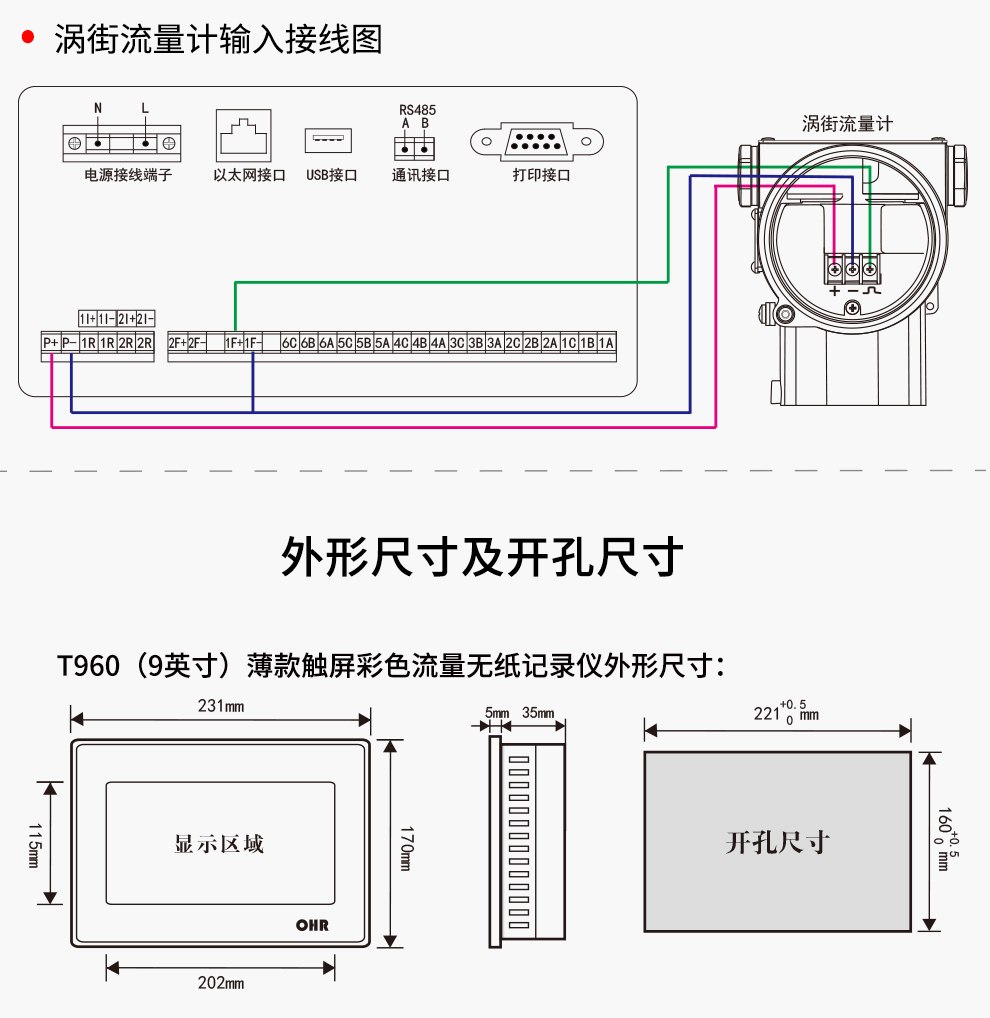 OHR-T系列觸摸超薄流量無紙記錄儀采用新型大規(guī)模集成電路,對輸入、輸出、電 源、信號采取可靠保護和強抗干擾設計。6路萬能輸入(可組態(tài)選擇輸入:標準電壓、 標準電流、熱電偶、熱電阻、頻率、毫伏等)其中可帶2路流量輸入。具有繼電器報警 輸出、變送輸出,饋電輸出,流量積算,溫壓補償功能。