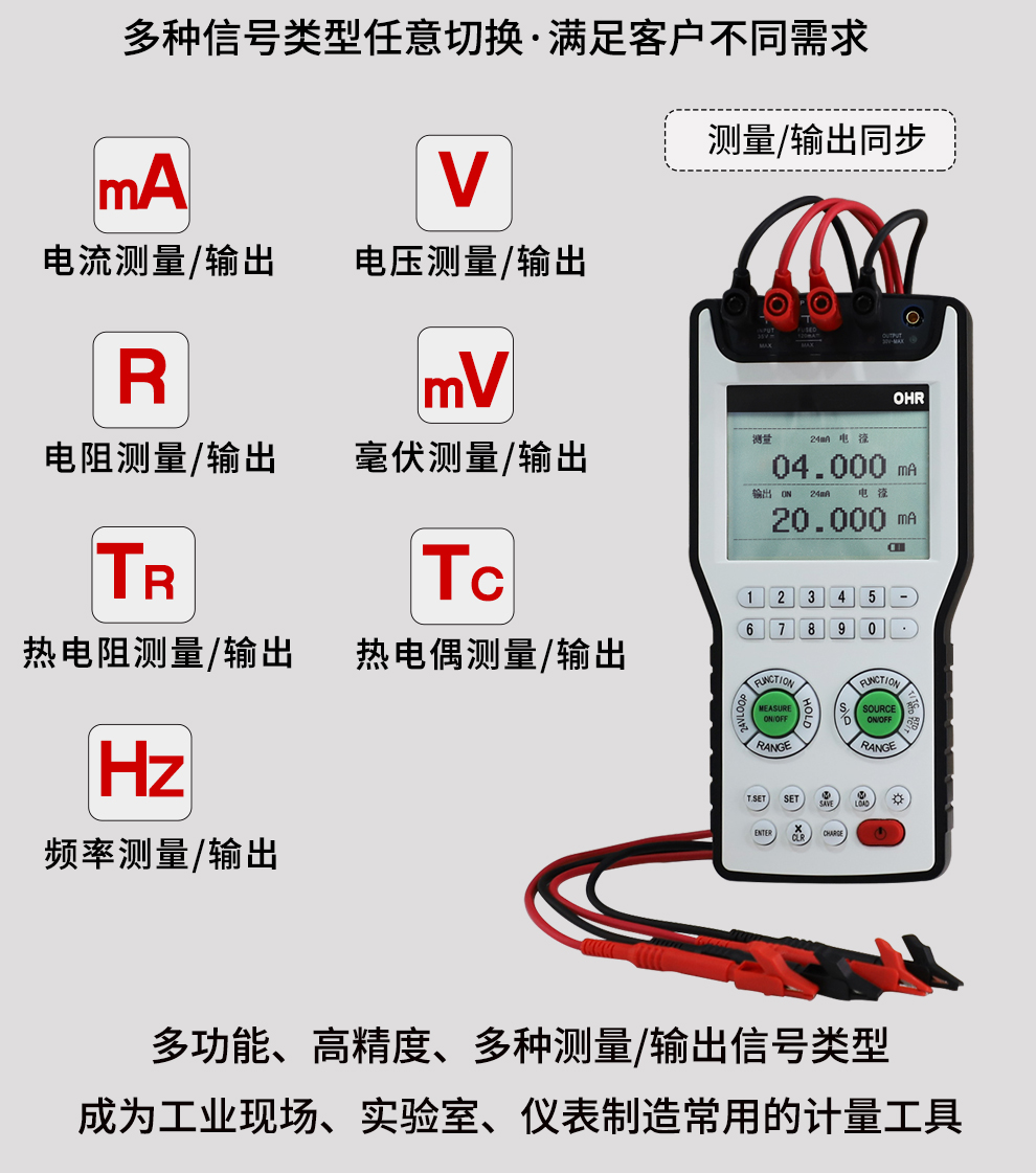 OHR-A00過程校驗(yàn)儀是一種多功能、高精度的便攜式儀器,可用于校準(zhǔn)、測試工業(yè)過程裝置及各種電氣設(shè)備,支持電流、電壓、電阻、頻率、熱電偶、熱電阻等多種信號類型,最高精度可達(dá)0.01%F.S,是工業(yè)現(xiàn)場、實(shí)驗(yàn)室以及各類儀表制造商必備的計(jì)量測試工具。