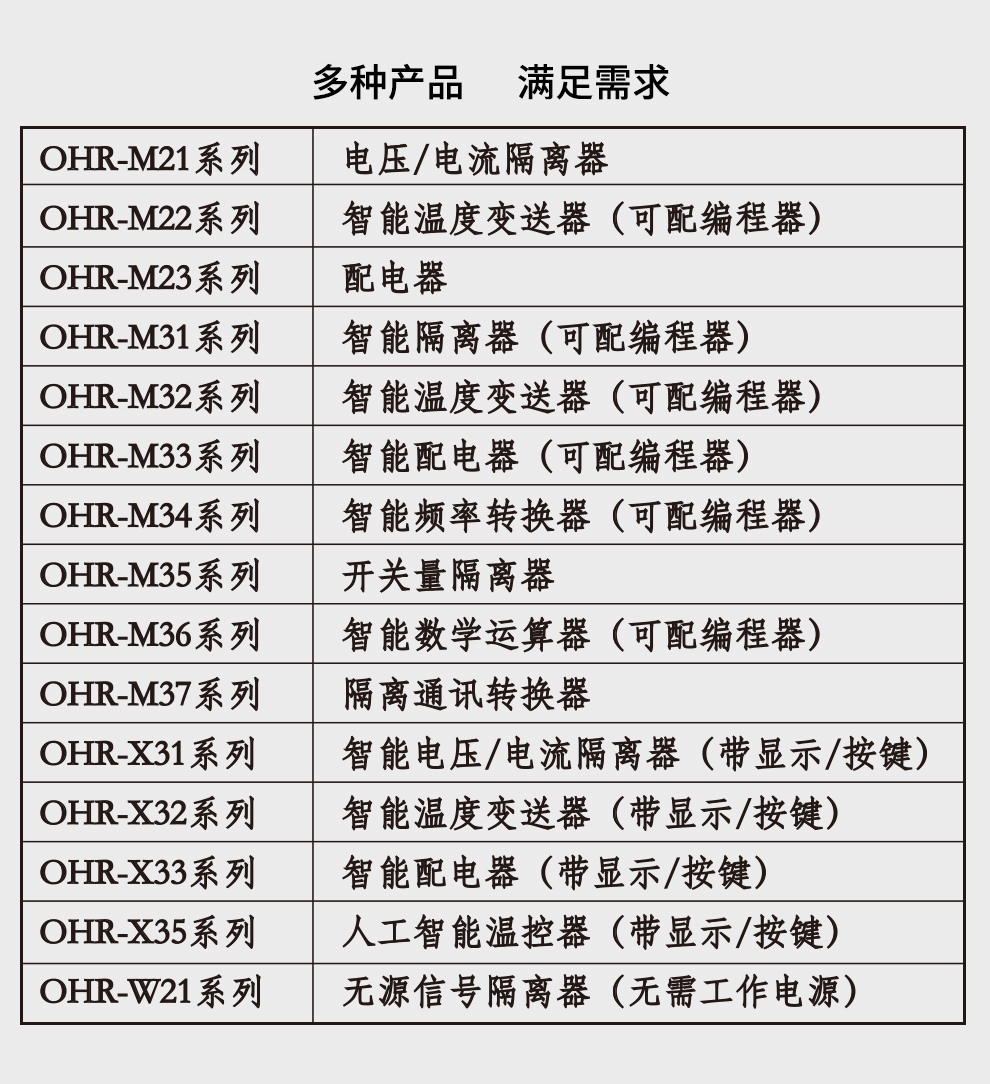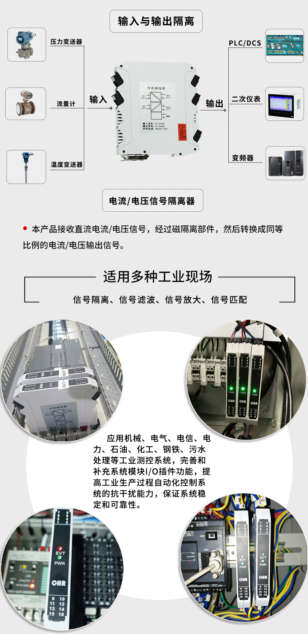 OHR-M21系列電壓/電流隔離器將直流電壓或電流信號(hào)經(jīng)過(guò)隔離傳送,轉(zhuǎn)換成所需的信號(hào)給其它儀表??梢耘c單元組合儀表及DCS、PLC等系統(tǒng)配套使用,給予現(xiàn)場(chǎng)儀表信號(hào)隔離、信號(hào)轉(zhuǎn)換、信號(hào)分配、信號(hào)處理等,從而提高工業(yè)生產(chǎn)過(guò)程自動(dòng)控制系統(tǒng)的抗干擾能力,保證系統(tǒng)的穩(wěn)定性和可靠性。