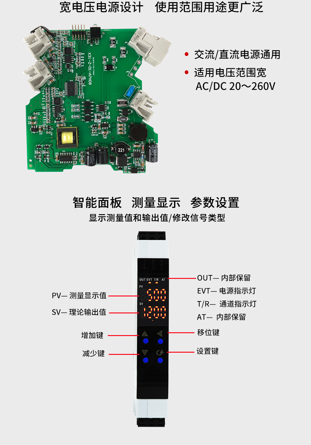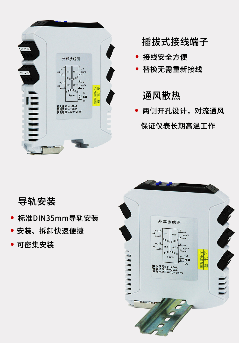 OHR-X31系列導(dǎo)軌式智能隔離器將現(xiàn)場(chǎng)的直流電壓或電流信號(hào)經(jīng)過(guò)隔離傳送,轉(zhuǎn)換成所需的信號(hào)給其它儀表。可以與DCS、PLC等系統(tǒng)配套使用,從而提高工業(yè)生產(chǎn)過(guò)程自動(dòng)控制系統(tǒng)的抗干擾能力,保證系統(tǒng)的穩(wěn)定性和可靠性。寬電源設(shè)計(jì):20-260V交直流供電。配置高清顯示單元,通過(guò)輕觸按鍵設(shè)置每個(gè)通道的參數(shù)及通道之間的切換。