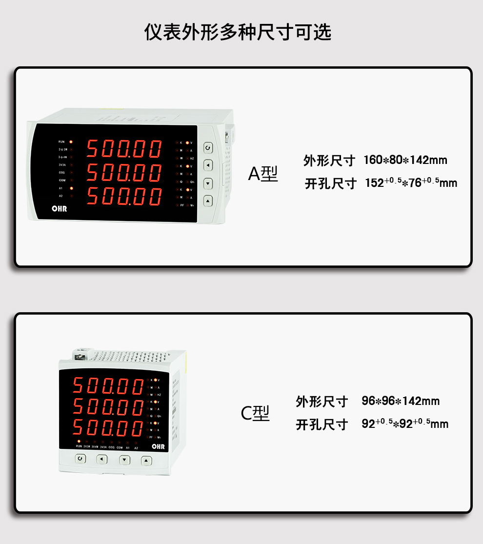 OHR-C300系列三相綜合電量表采用大規(guī)模集成電路和高亮度長(zhǎng)壽命的LED顯示器,應(yīng)用數(shù)字采樣技術(shù),對(duì)三相電氣線路中的相電壓、線電壓、相電流、線電流、有功功率、無(wú)功功率、視在功率、頻率、功率因數(shù)、等進(jìn)行實(shí)時(shí)測(cè)量顯示與控制。