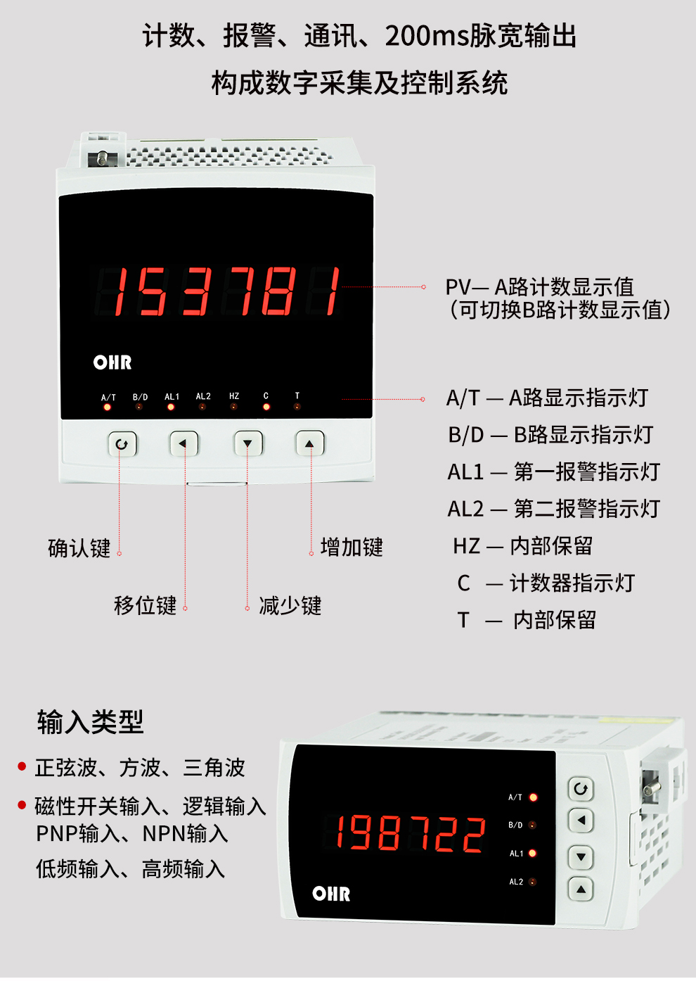 OHR-B300系列計(jì)數(shù)器采用全自動(dòng)貼片封裝工藝,具有很強(qiáng)的抗干擾能力,并具有多種輸出功能和控制功能,多種計(jì)數(shù)模式,廣泛運(yùn)用于電力、石化、冶金、輕工、制藥、航空等諸多領(lǐng)域。