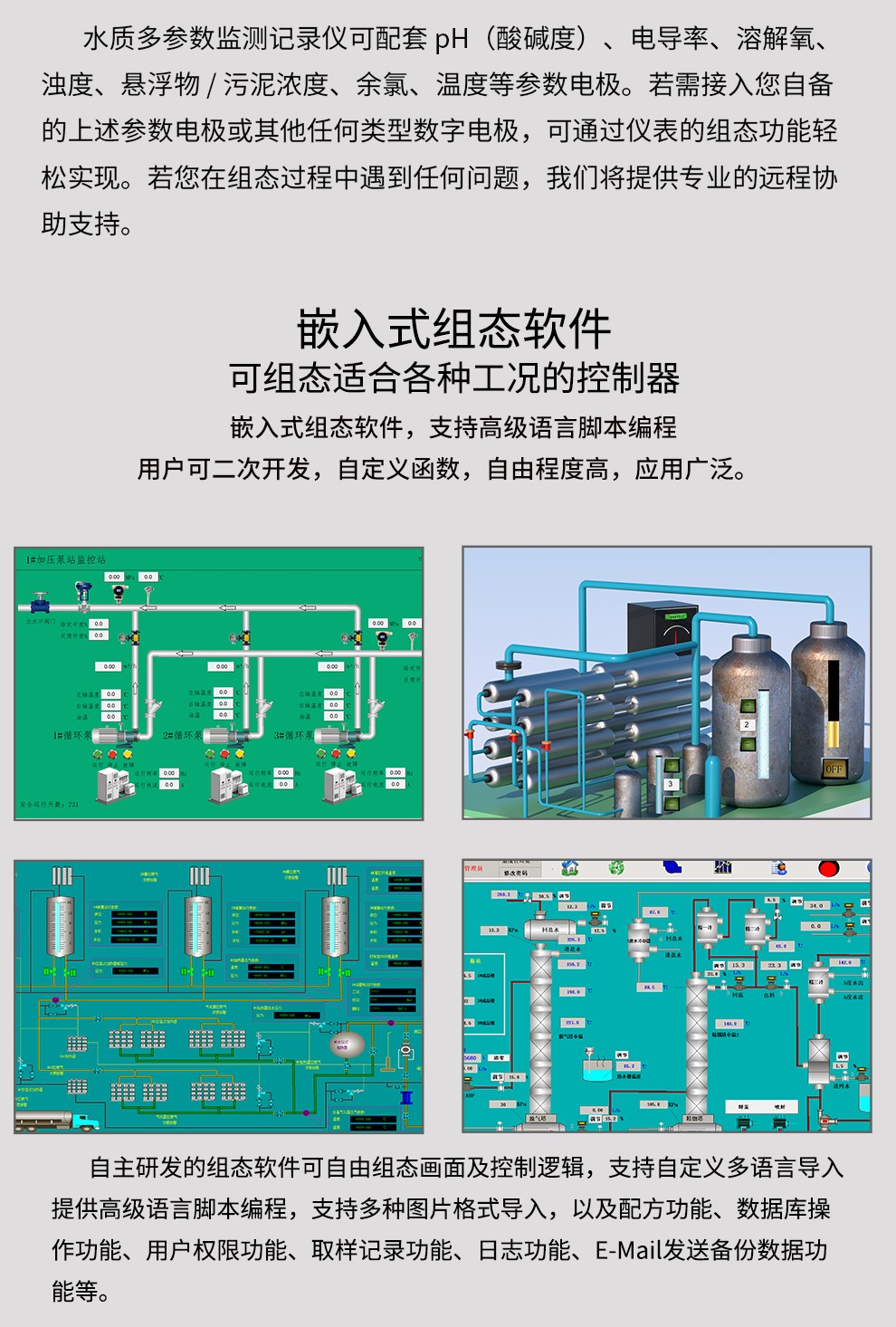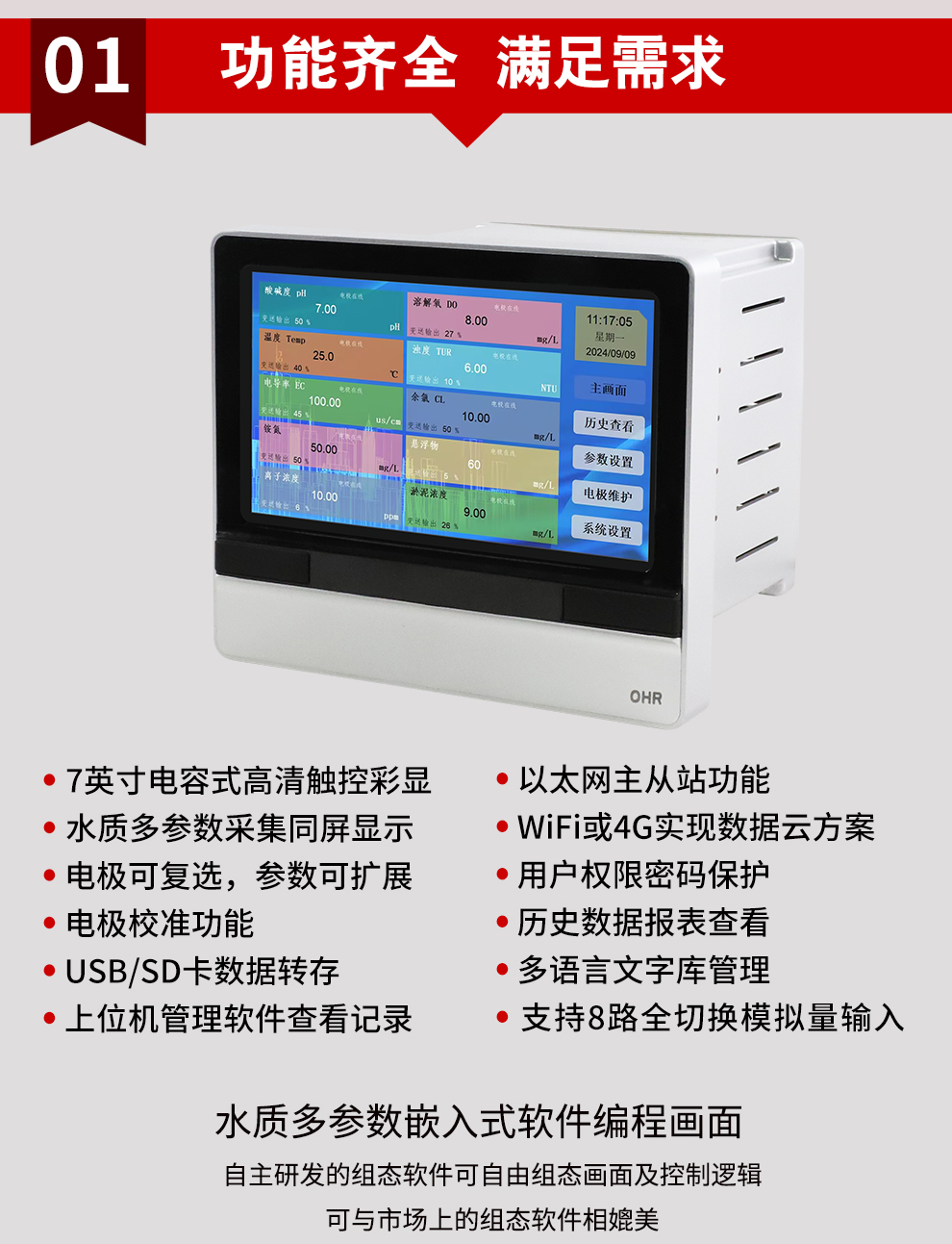OHR-SZ80系列水質(zhì)多參數(shù)監(jiān)測記錄儀是一款多參數(shù)可組合的水質(zhì)監(jiān)測控制器,可通過RS485通訊采集現(xiàn)場pH(酸堿度)、電導(dǎo)率、溶解氧、濁度、污泥、余氯、溫度等水質(zhì)參數(shù),產(chǎn)品可實現(xiàn)水質(zhì)電極的數(shù)據(jù)采集、記錄分析、變送、報警控制、以太網(wǎng)通訊、WiFi或4G實現(xiàn)數(shù)據(jù)云方案。