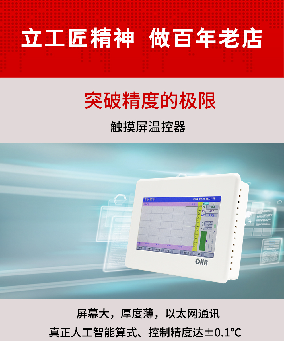 OHR系列觸摸屏溫控器采用真正的人工智能算式,儀表啟動自整定功能,可以根據(jù)被控對象的特性,自動尋找最優(yōu)參數(shù)以達到很好的控制效果,無需人工整定參數(shù)??販鼐然具_±0.1℃,無超調(diào)、欠調(diào),達國際先進水平。4路萬能信號輸入,可帶2路PID 控制,RS485通訊接口,以太網(wǎng)接口。