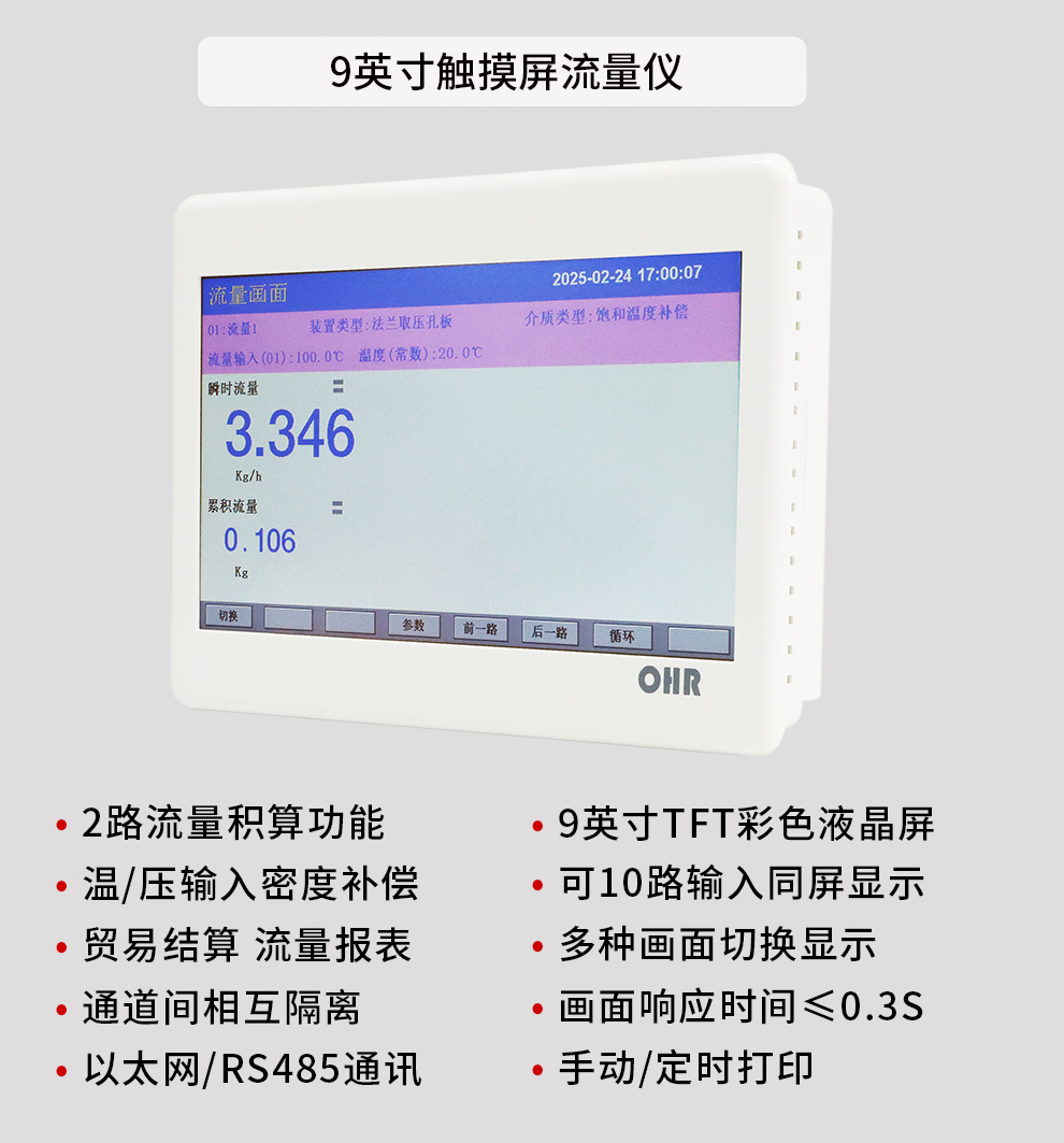 NHR系列系列觸摸屏流量儀最多6路萬能輸入其中可帶2路流量輸入。具有繼電器報警輸出、變送 輸出,饋電輸出,流量積算,溫壓補償功能;可帶RS485通訊接口,以太網接口,微型打印機接口;具有強大的顯示功能,實時測量顯示,棒圖顯示,報警狀態(tài)顯示,流量顯