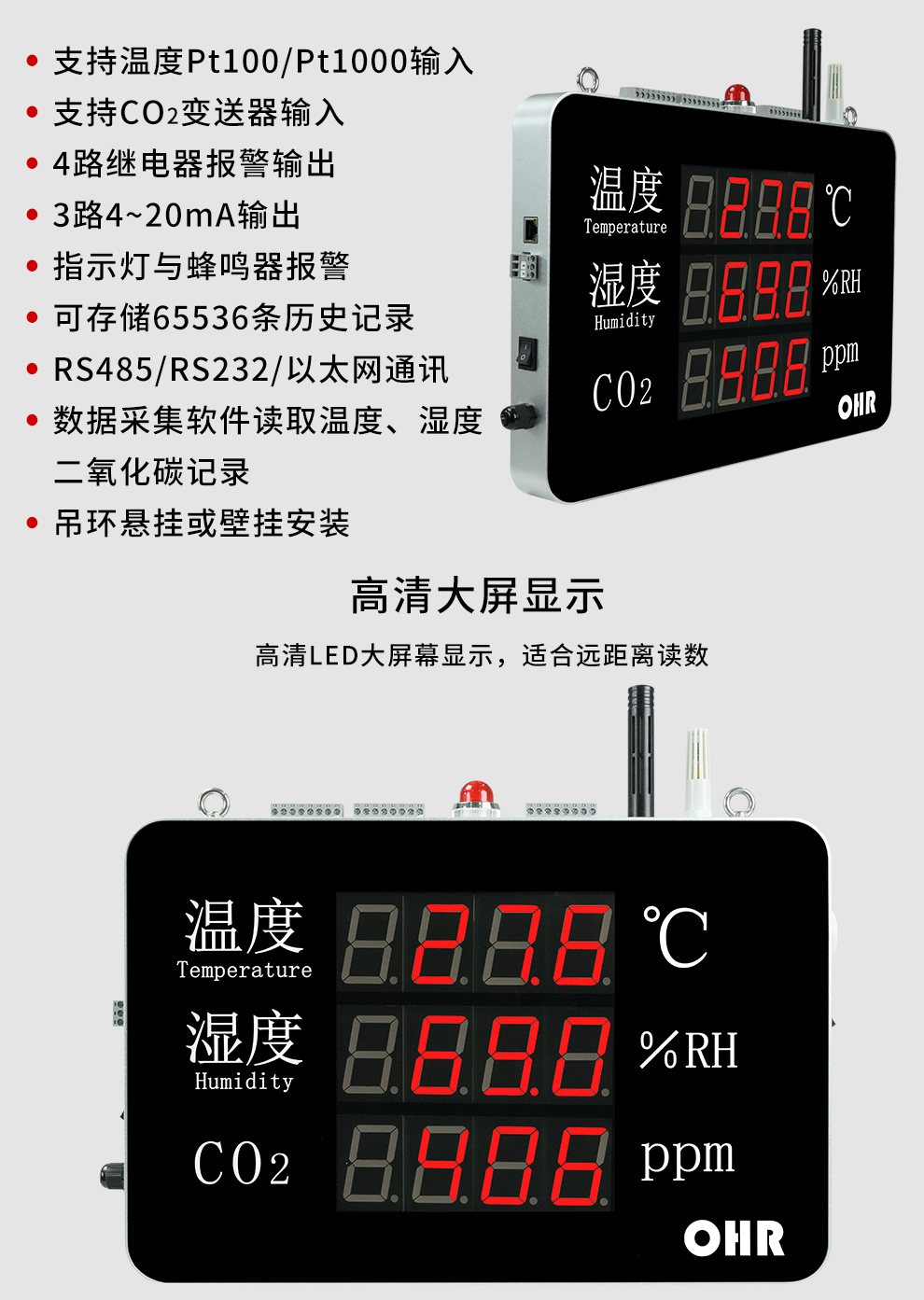 OHR-WS54系列大屏二氧化碳溫濕度記錄儀采用高精度的采集電路及進(jìn)口傳感器,對(duì)環(huán)境的二氧化碳、溫濕 度等進(jìn)行實(shí)時(shí)監(jiān)測(cè)、報(bào)警與記錄。本產(chǎn)品采用鋁合金邊框,高品質(zhì)亞克力面板,外觀美觀大方;大屏幕 LED數(shù)碼管顯示,醒目、便捷,實(shí)時(shí)顯示二氧化碳值和溫濕度值等信息;可選配RS485、RS232通訊接口或以 太網(wǎng)通訊接口,通過配套的上位機(jī)軟件讀取歷史記錄。該產(chǎn)品適用于多種場(chǎng)合,尤其適用于倉(cāng)庫(kù)、車間、 畜牧業(yè)中室內(nèi)環(huán)境溫濕度的監(jiān)測(cè)。