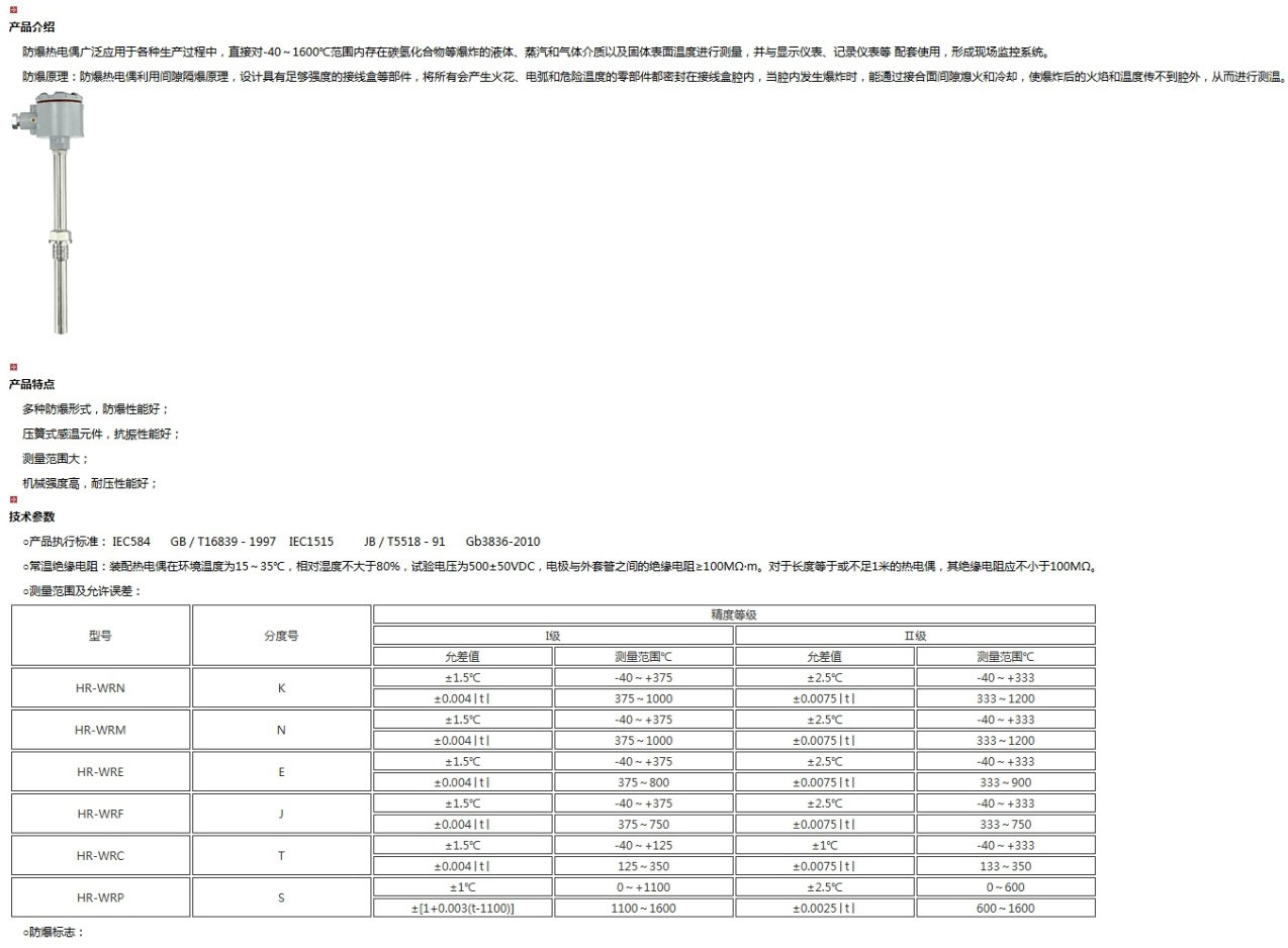 隔爆熱電偶是一種溫度傳感器,在化學工業(yè)自控系統(tǒng)中應用極廣,通過溫度傳感器,可將控制對象的溫度參數(shù)變成電信號,傳遞給顯示、記錄和調節(jié)儀,對系統(tǒng)施行檢測、調節(jié)和控制。在化工廠,生產現(xiàn)場常伴有各種易燃、易爆等 化學氣體、蒸汽,如果使用普通的熱電偶非常不安全,極易引起環(huán)境氣體爆炸。