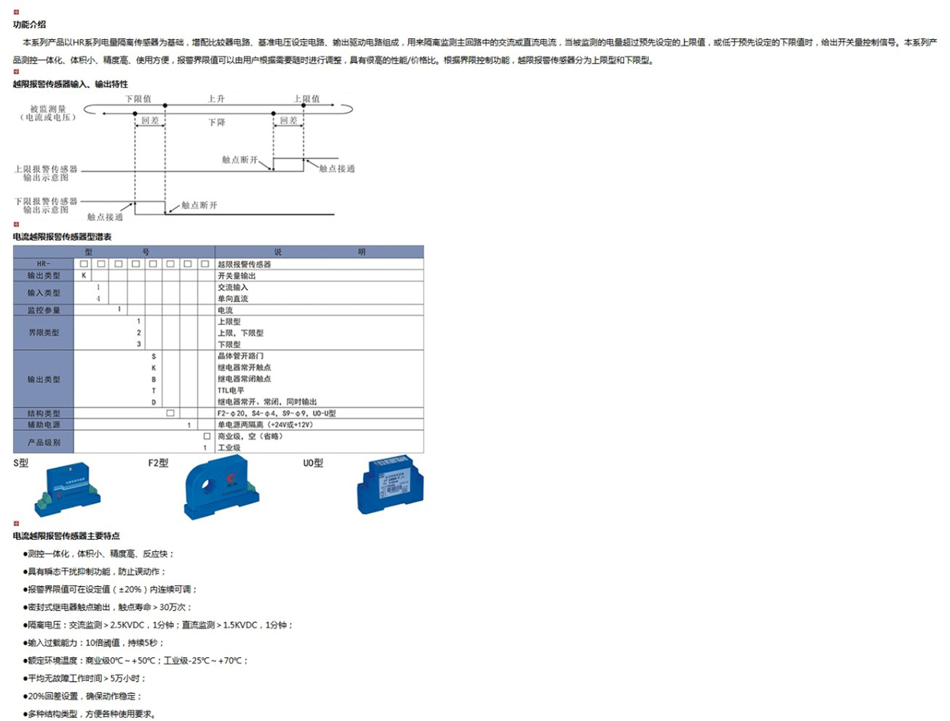 電流越限報(bào)警傳感器以HR系列電量隔離傳感器為基礎(chǔ),增配比較器電路、基準(zhǔn)電壓設(shè)定電路、輸出驅(qū)動電路組成,用來隔離監(jiān)測主回路中的交流或直流電流,當(dāng)被監(jiān)測的電量超過預(yù)先設(shè)定的上限值,或低于預(yù)先設(shè)定的下限值時(shí),給出開關(guān)量控制信號。